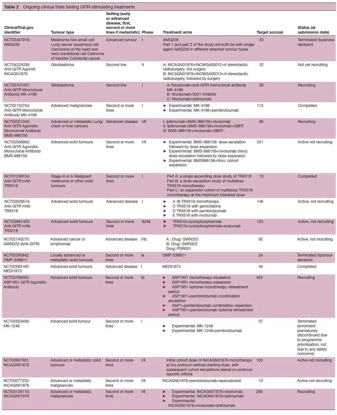 人源性IgG1激动剂GITR单克隆抗体MK-4166与抗PD-1单克隆抗体pembrolizumab联合使用,显示出良好的安全性和潜在的活性,特别是在对治疗不敏感的黑色素瘤患者中。其他正在研究的GITR抗体包括ASP1951(PTZ-522),一种四价单特异性(TM)抗GITR激动剂抗体(NCT03799003);INCAGN01876,一种人源化IgG1单抗(NCT03126110)和GWN323(NCT02740270)。