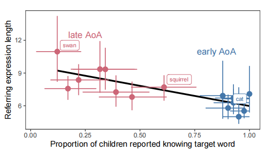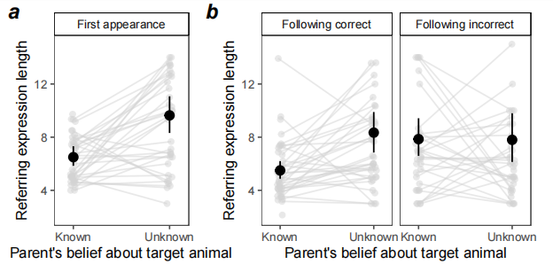 图b中,孩子作出正确选项后,父母会继续用更长的表述方式来形容他们认为孩子不认识的动物。然而,如果家长认为孩子认识那个动物,但孩子选择了错误选项,就会在下一次出现同一动物时使用更长的表述。该实验验证了团队之前的想法,同时还发现,父母不仅使用了孩子已经掌握的语言知识,还能在意识到孩子不认识某种动物时,改变他们的表达方式。