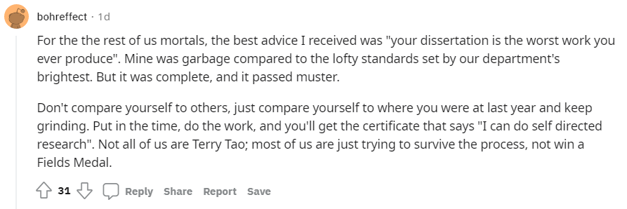 最后这位小哥希望网友们对他的博士生涯给他两个建议(1)提高最终,你的博士学位就是你的博士学位。这真的只是第一步,如果你渴望在训练中改变世界,这可能会让你失望。尽管要完成的必要贡献微乎其微,但不要去磨练那些能让你接受挑战的技能。比如详细的笔记,严格的编程,以及在一个感兴趣的领域保持最新的习惯,包括与同龄人的接触。这些绝不是一个完整的列表,只是那些我很高兴我继续工作。网友表示赞同,永远记得博士学位只是你的起点绝非重点,这只是你接受教育的一部分而已。还有网友表示,这简直跟自传一样!看来每个人的博士生涯都很难过。进入工业界是我做过的最好的决定。“我找到了 x 模型,并把它应用到问题 y 上以得到更好的结果”正是公司所看重的,能够解决问题的人才。还有的网友劝他要懂得平凡的可贵,每天比昨天的自己进步一点,就是最大的成就。对于我们这些凡人来说,我收到的最好的建议就是“你的论文是你写过的最糟糕的作品”。与我们部门最聪明的人设定的高标准相比,我的简直是垃圾。但是它是完整的,并且通过了检查。不要拿自己和别人比较,只要把自己和去年做比较,然后继续努力。投入时间,做好工作,你就会得到一张证书,上面写着“我可以做自我导向的研究”。并不是所有人都是陶哲轩,我们中的大多数人只是想在这个过程中生存下来,而不是赢得菲尔兹奖。机器学习行业从业者大多经常困惑于自己是算法工程师还是调参侠。在深度学习浪潮下,有这种困惑也是十分正常,或许我们也应该思考一下,为什么大家普遍会有这种困惑。看了这段话,大家可能多多少少都有所感同身受吧,高学历,却换来更大的失落;工作内容重复,没有看的见的快乐。入行之后,你眼中的AI变成了一个个黑盒的模型,我要更多更干净的数据,更庞大的模型!「有多少人工,就有多少智能」,即使在深度学习时代也是如此,各大AI公司首先招聘的就是标注员。科研机构发布新数据集的论文也会公布自己用了多少标注人员,时薪多少美元等。而且在互联网高度发达的今天,你想要学习的任何东西都可以在网络上找到,AI入行的门槛从未这么低。入门简单,但成为大师却要付出更多的努力,这期间会经历迷茫,例如在reddit上发帖,但最后有所成就的还是那些耐得住学术寂寞的人。不仅仅追随深度学习潮流,而是在其中挖掘属于自己的东西,也许是博士学位能带来的最大收获。