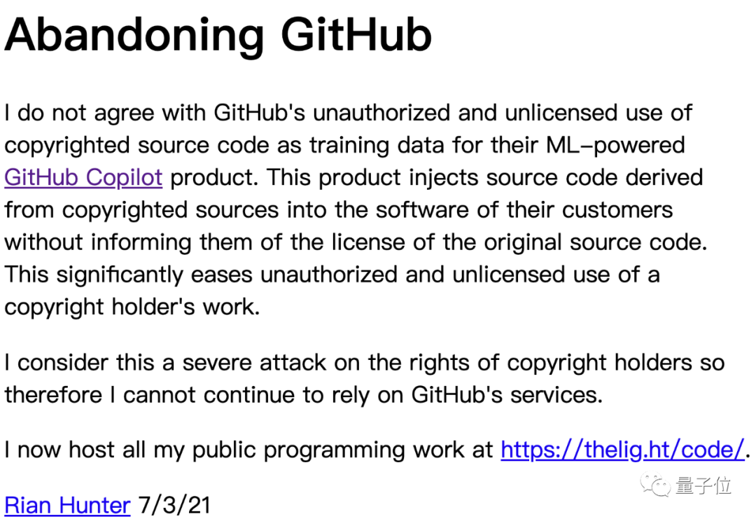 7月3日,有开发者站出来抵制GitHub Copilot,表示自己再也不会使用GitHub来托管代码: