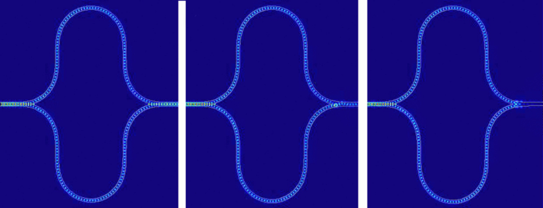 图注:Lightmatter 的神经网络加速器中集成的 Mach-Zehnder 干涉仪模拟显示了三种不同的状态,其中在干涉仪的两个分支中传播的光经历了不同的相对相移。