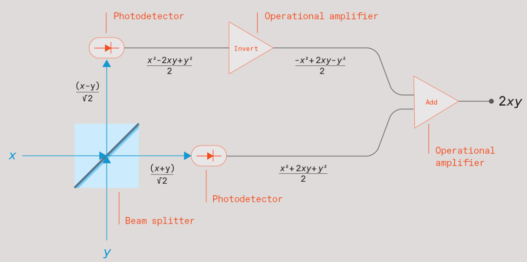 图注:两束光线撞上一个光束分束器(蓝色方块),光束的强度与它们要相乘的数字 x 与 y 相当。离开分束器的光束照在光电探测器(椭圆形)上,提供与光强度平方成正比的电信号。将一个光电探测器信号调反,并将其与另一个信号相加,就会产生一个与两个输入的乘积成正比的信号。