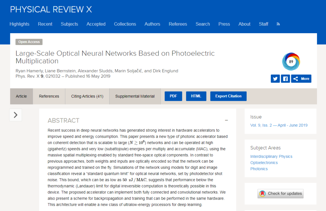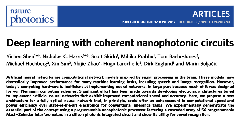 我们注意到,之前获得麻省理工科技评论“35岁以下科技创新35人”的中国青年科学家沈亦晨也在光子研究上有所成就。沈亦晨的博士毕业于 MIT,在2017年与 Nicholas Harris 发表了一篇如今谷歌学术引用接近1000的论文(“Deep learning with coherent nanophotonic circuits”),谈到将光学应用于机器学习任务,比如语音和图像识别。