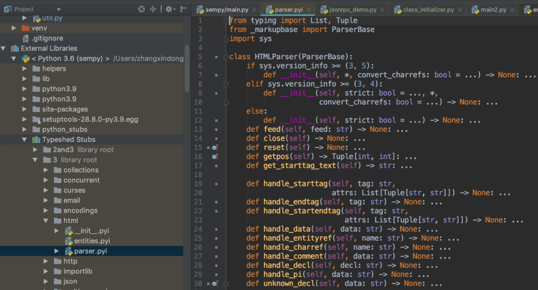 最早的官方推出的mypy是由Python之父Guido van Rossum亲自开发,被各种主流编辑器所集成(如PyCharm, Emacs, Sublime Text, VS Code等),用户基础和文档经验都很丰富。谷歌的pytype可以做类型检查,并且提供了一些实用小工具,下文会简单介绍下其应用:微软的pyright是最晚开源推出的,宣称有以下优点:接下来重点介绍一下pytype。为什么选取pytype呢,首先mypy比较古老,很多功能没有新出的工具新颖和实用。计划使用Python LSP来处理Python文件提供一些语法服务的功能,pyre-check用的是Ocamel,所以我们就拿Python语言的pytype来实现想要的功能,而且pytype提供了一些实用工具,比如解析一个pyi文件,基于Python文件生成pyi文件等。pyi的“i”指的是interfiace,将Python文件的类型定义用接口的形式存储到pyi文件里,来辅助类型检查。大家常用的Pycharm,可以关注下项目空间的External Libraries > Python 3.6 > Typeshed Stubs里面就有许多内置的pyi文件,来辅助编码过程的类型提示和定位。
