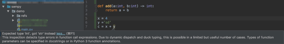 随着持续的演进,到Python3.5,能够做到Type Hints,配合类型标注,IDE可以做Type Checking。