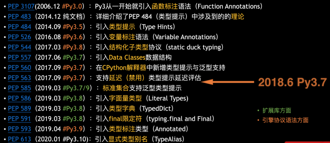 Python是一门强类型的动态类型语言,开发者可以给对象动态指定类型(动态),但类型不匹配的操作是不被允许的(强类型,如str和int两个变量无法相加)。动态类型帮助开发者写代码轻松愉快,然而,俗话说:动态一时爽,重构火葬场。动态类型也带来了许多麻烦,如果动态语言能加入静态类型标记的话,主要有以下几点好处:目前主流语言大多数是支持静态类型的,如Java,Go,Rust。而动态语言(Python,JS)也在拥抱静态类型,如TypeScript。本文主要介绍一下Python对静态类型的支持、社区发展的现状、类型检查工具介绍与对比,以及类型解析的实战。早在06年的Python3.0就引入了类型annotation的语法,并列出了许多改进项。