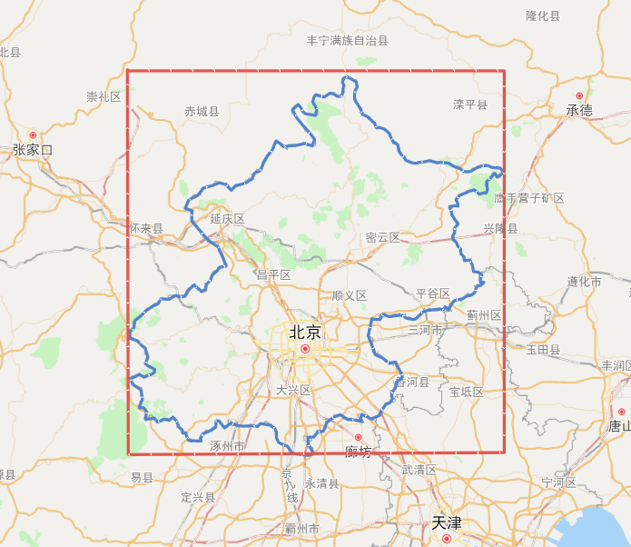 矩形区域 上图中我们可以看到矩形区域很多部分不属于北京,所以在后续的道具数据采集的时候需要进行判断道路归属省份是否为北京。