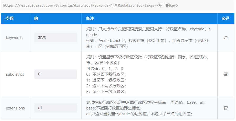 多边形搜索 那么,新的问题也来了:如何进行经纬度区域划分呢?我们又找到了行政区域查询接口文档:https://lbs.amap.com/api/webservice/guide/api/district