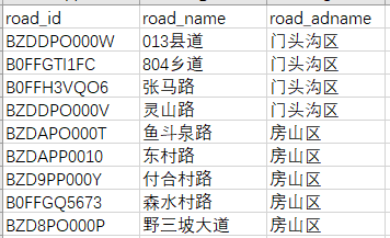 # 获取指定区域指定page的道路数据并存到本地 def get_road(polygon,page): url = 'https://restapi.amap.com/v3/place/polygon?' params = { 'key' :key, 'polygon' :polygon, 'keywords' :'道路名' , 'types' :190301, 'offset' :20, 'page' :page, 'extensions' :'all' , } r = requests.get(url,params=params) data = r.json() pois = data['pois' ] file_name = '北京道路名称数据.csv' for poi in pois: if poi['pname' ] =='北京市' : df = pd.DataFrame({ 'road_id' : poi['id' ], 'road_name' : poi['name' ], 'road_adname' : poi['adname' ] },index=[0]) if os.path.exists(file_name): df.to_csv(file_name, mode='a' , header=False, index=None, encoding='utf_8_sig' ) else :