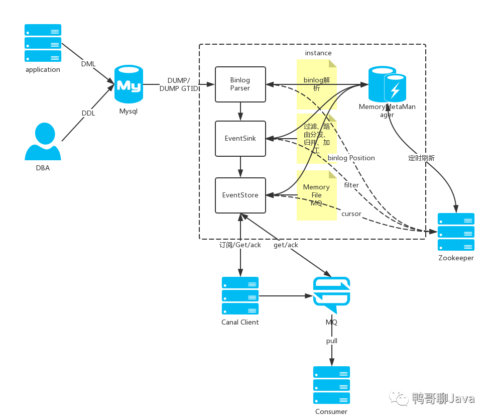 canal 由Java开发,分为服务端和客户端,拥有众多的衍生应用,性能稳定,功能强大;canal 需要自己编写客户端来消费canal解析到的数据。
