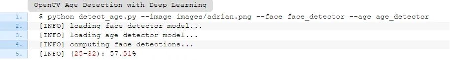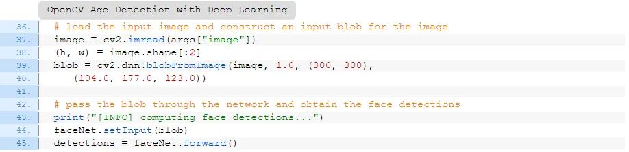 # construct a blob from *just* the face ROI faceBlob = cv2.dnn.blobFromImage(face, 1.0, (227, 227), (78.4263377603, 87.7689143744, 114.895847746), swapRB=False) # make predictions on the age and find the age bucket with # the largest corresponding probability ageNet.setInput(faceBlob) preds = ageNet.forward() i = preds[0].argmax() age = AGE_BUCKETS[i] ageConfidence = preds[0][i]