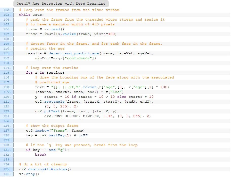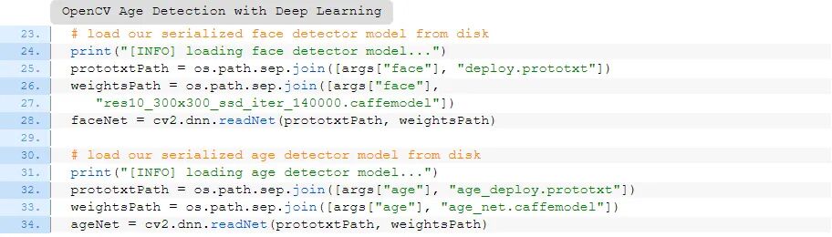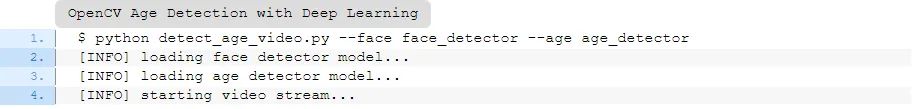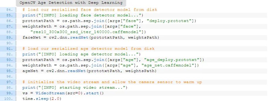 # load our serialized face detector model from disk print("[INFO] loading face detector model...") prototxtPath = os.path.sep.join([args["face"], "deploy.prototxt"]) weightsPath = os.path.sep.join([args["face"], "res10_300x300_ssd_iter_140000.caffemodel"]) faceNet = cv2.dnn.readNet(prototxtPath, weightsPath) # load our serialized age detector model from disk print("[INFO] loading age detector model...") prototxtPath = os.path.sep.join([args["age"], "age_deploy.prototxt"]) weightsPath = os.path.sep.join([args["age"], "age_net.caffemodel"]) ageNet = cv2.dnn.readNet(prototxtPath, weightsPath) # initialize the video stream and allow the camera sensor to warm up print("[INFO] starting video stream...") vs = VideoStream(src=0).start() time.sleep(2.0)