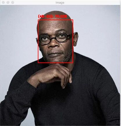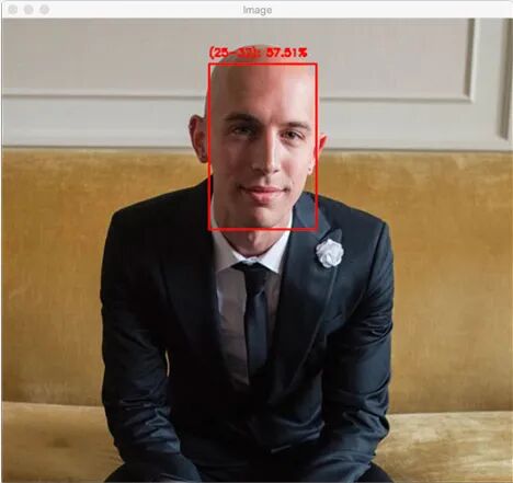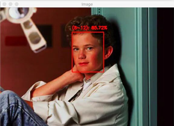 # make predictions on the age and find the age bucket with # the largest corresponding probability ageNet.setInput(faceBlob) preds = ageNet.forward() i = preds[0].argmax() age = AGE_BUCKETS[i] ageConfidence = preds[0][i] # display the predicted age to our terminal text = "{}: {:.2f}%".format(age, ageConfidence * 100) print("[INFO] {}".format(text)) # draw the bounding box of the face along with the associated # predicted age y = startY - 10 if startY - 10 > 10 else startY + 10 cv2.rectangle(image, (startX, startY), (endX, endY), (0, 0, 255), 2) cv2.putText(image, text, (startX, y), cv2.FONT_HERSHEY_SIMPLEX, 0.45, (0, 0, 255), 2) # display the output image cv2.imshow("Image", image) cv2.waitKey(0)