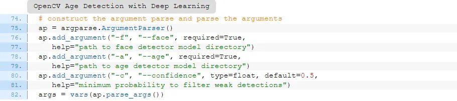 # construct the argument parse and parse the arguments ap = argparse.ArgumentParser() ap.add_argument("-f", "--face", required=True, help="path to face detector model directory") ap.add_argument("-a", "--age", required=True, help="path to age detector model directory") ap.add_argument("-c", "--confidence", type=float, default=0.5, help="minimum probability to filter weak detections") args = vars(ap.parse_args())