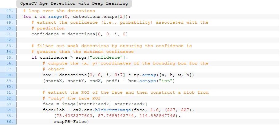 # loop over the detections for i in range(0, detections.shape[2]): # extract the confidence (i.e., probability) associated with the # prediction confidence = detections[0, 0, i, 2] # filter out weak detections by ensuring the confidence is # greater than the minimum confidence if confidence > args["confidence"]: # compute the (x, y)-coordinates of the bounding box for the # object box = detections[0, 0, i, 3:7] * np.array([w, h, w, h]) (startX, startY, endX, endY) = box.astype("int") # extract the ROI of the face and then construct a blob from # *only* the face ROI face = image[startY:endY, startX:endX] faceBlob = cv2.dnn.blobFromImage(face, 1.0, (227, 227), (78.4263377603, 87.7689143744, 114.895847746), swapRB=False)