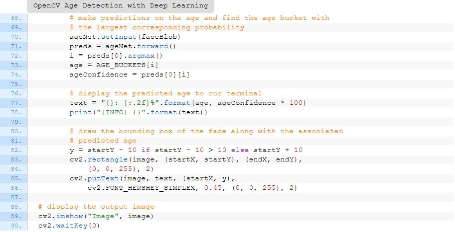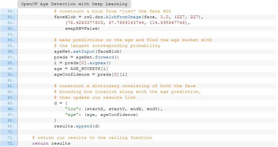 # construct a dictionary consisting of both the face # bounding box location along with the age prediction, # then update our results list d = { "loc": (startX, startY, endX, endY), "age": (age, ageConfidence) } results.append(d) # return our results to the calling function return results