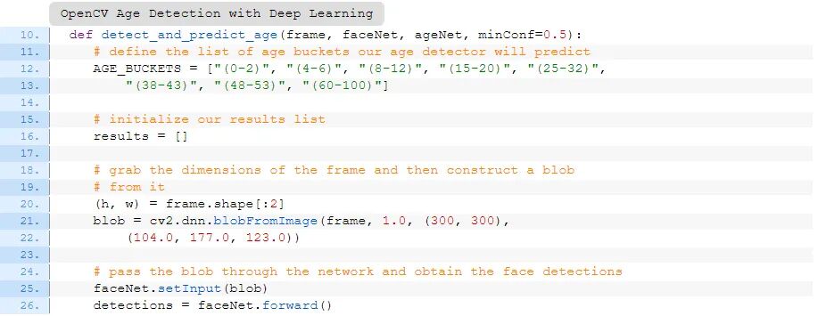 def detect_and_predict_age(frame, faceNet, ageNet, minConf=0.5): # define the list of age buckets our age detector will predict AGE_BUCKETS = ["(0-2)", "(4-6)", "(8-12)", "(15-20)", "(25-32)", "(38-43)", "(48-53)", "(60-100)"] # initialize our results list results = [] # grab the dimensions of the frame and then construct a blob # from it (h, w) = frame.shape[:2] blob = cv2.dnn.blobFromImage(frame, 1.0, (300, 300), (104.0, 177.0, 123.0)) # pass the blob through the network and obtain the face detections faceNet.setInput(blob) detections = faceNet.forward()