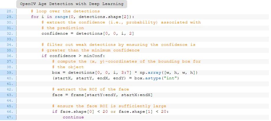 # loop over the detections for i in range(0, detections.shape[2]): # extract the confidence (i.e., probability) associated with # the prediction confidence = detections[0, 0, i, 2] # filter out weak detections by ensuring the confidence is # greater than the minimum confidence if confidence > minConf: # compute the (x, y)-coordinates of the bounding box for # the object box = detections[0, 0, i, 3:7] * np.array([w, h, w, h]) (startX, startY, endX, endY) = box.astype("int") # extract the ROI of the face face = frame[startY:endY, startX:endX] # ensure the face ROI is sufficiently large if face.shape[0] < 20 or face.shape[1] < 20: continue