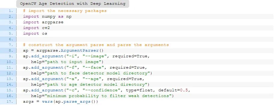# import the necessary packages import numpy as np import argparse import cv2 import os # construct the argument parse and parse the arguments ap = argparse.ArgumentParser() ap.add_argument("-i", "--image", required=True, help="path to input image") ap.add_argument("-f", "--face", required=True, help="path to face detector model directory") ap.add_argument("-a", "--age", required=True, help="path to age detector model directory") ap.add_argument("-c", "--confidence", type=float, default=0.5, help="minimum probability to filter weak detections") args = vars(ap.parse_args())