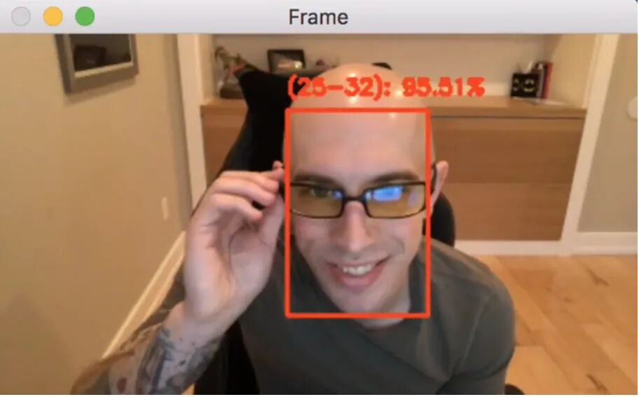 # to have a maximum width of 400 pixels frame = vs.read() frame = imutils.resize(frame, width=400) # detect faces in the frame, and for each face in the frame, # predict the age results = detect_and_predict_age(frame, faceNet, ageNet, minConf=args["confidence"]) # loop over the results for r in results: # draw the bounding box of the face along with the associated # predicted age text = "{}: {:.2f}%".format(r["age"][0], r["age"][1] * 100) (startX, startY, endX, endY) = r["loc"] y = startY - 10 if startY - 10 > 10 else startY + 10 cv2.rectangle(frame, (startX, startY), (endX, endY), (0, 0, 255), 2) cv2.putText(frame, text, (startX, y), cv2.FONT_HERSHEY_SIMPLEX, 0.45, (0, 0, 255), 2) # show the output frame cv2.imshow("Frame", frame) key = cv2.waitKey(1) & 0xFF # if the `q` key was pressed, break from the loop if key == ord("q"): break # do a bit of cleanup cv2.destroyAllWindows() vs.stop()