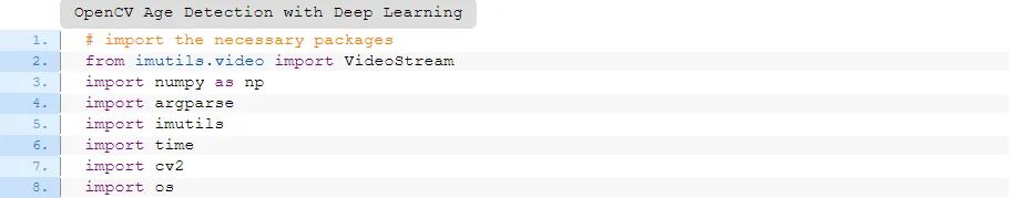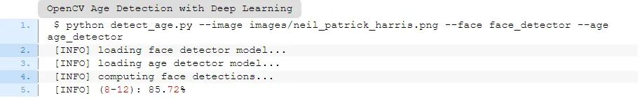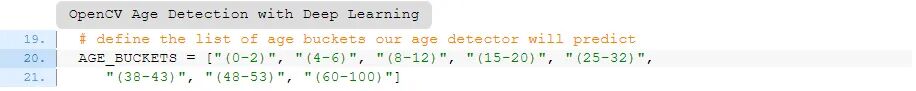 # define the list of age buckets our age detector will predict AGE_BUCKETS = ["(0-2)", "(4-6)", "(8-12)", "(15-20)", "(25-32)", "(38-43)", "(48-53)", "(60-100)"]