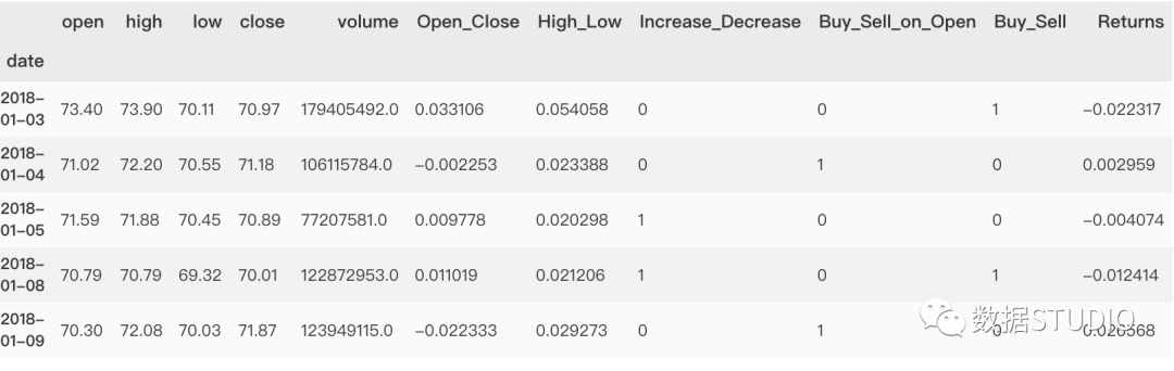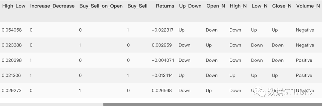 # 创造更多的时间 dataset['Open_N' ] = np.where(dataset['open' ].shift(-1 ) > dataset['open' ],'Up' ,'Down' ) dataset['High_N' ] = np.where(dataset['high' ].shift(-1 ) > dataset['high' ],'Up' ,'Down' ) dataset['Low_N' ] = np.where(dataset['low' ].shift(-1 ) > dataset['low' ],'Up' ,'Down' ) dataset['Close_N' ] = np.where(dataset['close' ].shift(-1 ) > dataset['close' ],'Up' ,'Down' ) dataset['Volume_N' ] = np.where(dataset['volume' ].shift(-1 ) > dataset[