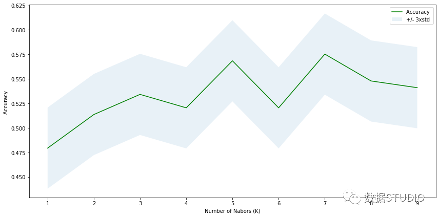 带误差线的学习曲线 from sklearn import metrics Ks = 10 mean_acc = np.zeros((Ks-1 )) std_acc = np.zeros((Ks-1 )) ConfustionMx = [];for n in range(1 ,Ks): # 模型训练和预测 neigh = KNeighborsClassifier(n_neighbors = n).fit(X_train,y_train) yhat=neigh.predict(X_test) mean_acc[n-1 ] = metrics.accuracy_score(y_test, yhat) std_acc[n-1 ]=np.std(yhat==y_test)/np.sqrt(yhat.shape[0 ])# 绘图 plt.figure(figsize=(12 ,6 )) plt.plot(range(1 ,Ks),mean_acc,'g' ) plt.fill_between(range(1 ,Ks),mean_acc - 1 * std_acc,mean_acc + 1 * std_acc, alpha=0.10 ) plt.legend(('Accuracy ' , '+/- 3xstd' )) plt.ylabel('Accuracy ' ) plt.xlabel('Number of Nabors (K)' ) plt.tight_layout() plt.show()# print( "The best accuracy was with", mean_acc.max(), "with k="
