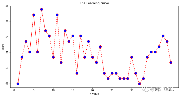 , marker='o' , markerfacecolor='blue' , markersize=10 ) plt.title('The Learning curve' ) plt.xlabel('K Value' ) plt.ylabel('Score' )