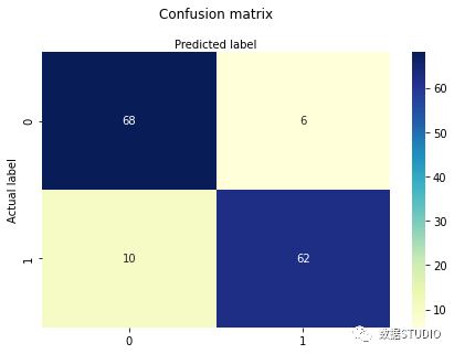 # create heatmap sns.heatmap(pd.DataFrame(cm_matrix), annot=True , cmap="YlGnBu" ,fmt='g' ) ax.xaxis.set_label_position("top" ) plt.tight_layout() plt.title('Confusion matrix' , y=1.1 ) plt.ylabel('Actual label' ) plt.xlabel('Predicted label' ) plt.show() print("Accuracy:" ,metrics.accuracy_score(y_test, y_pred))