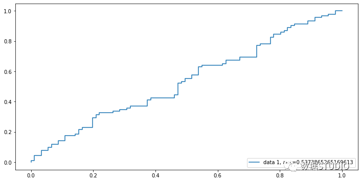 y_pred_proba = LR.predict_proba(X_test)[::,1 ] fpr, tpr, _ = metrics.roc_curve(y_test, y_pred_proba) auc = metrics.roc_auc_score(y_test, y_pred_proba) plt.figure(figsize=(12 ,6 )) plt.plot(fpr,tpr,label="data 1, auc=" +str(auc)) plt.legend(loc=4 ) plt.show()