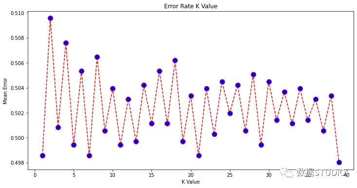 误差率可视化 error = []# 计算K值在1-40之间多误差值 for i in range(1 , 40 ): knn = KNeighborsClassifier(n_neighbors=i) knn.fit(X_train, y_train) pred_i = knn.predict(X_test) error.append(np.mean(pred_i != y_test)) plt.figure(figsize=(12 , 6 )) plt.plot(range(1 , 40 ), error, color='red' , linestyle='dashed' , marker='o' , markerfacecolor='blue' , markersize=10 ) plt.title('Error Rate K Value' ) plt.xlabel('K Value' ) plt.ylabel('Mean Error' )