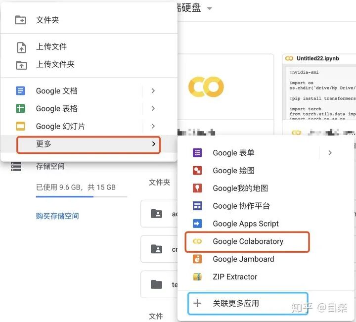 在使用上,点击之前图里的新建,然后点击更多,再点击colab就可以新建文件了,当然如果是第一次使用,可能存在colab选项不显示的情况,点击关联更多应用即可。