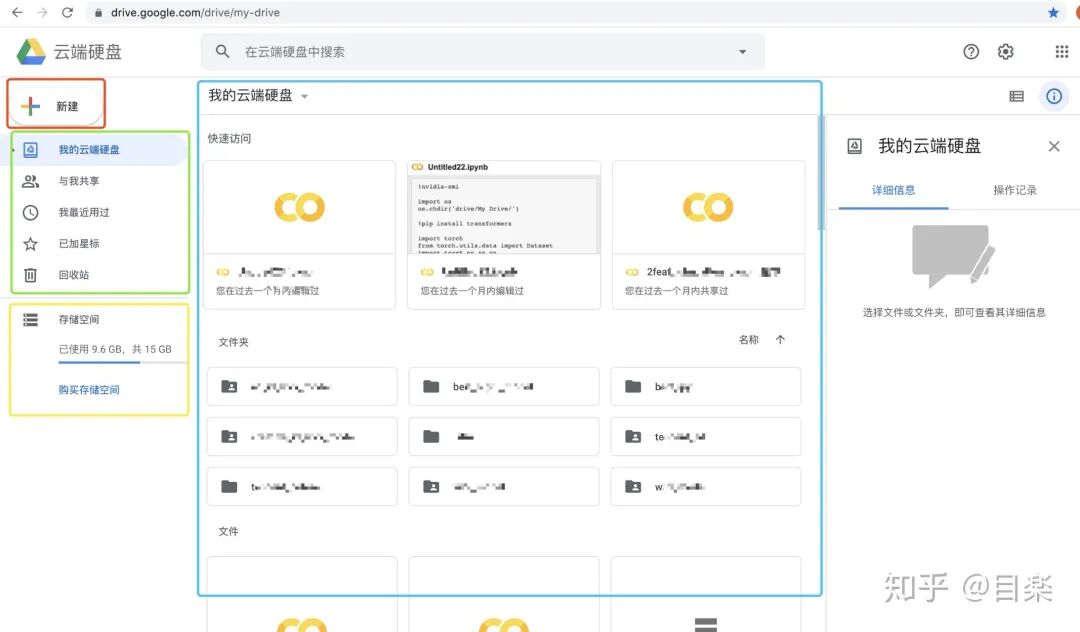 如上图所示,红框是新建文件(比如colab文件)绿框是对已有文件,共享文件之类的查看,黄框是储存空间显示,蓝框是存储空间文件可视化。