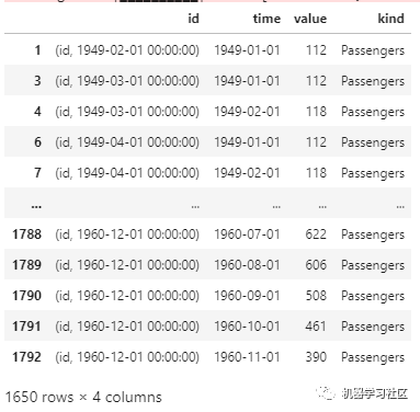 # Use Forecasting frame from tsfresh for rolling forecast training df_shift, y_air = make_forecasting_frame(df_air["Passengers"], kind="Passengers", max_timeshift=12, rolling_direction=1) print(df_shift)