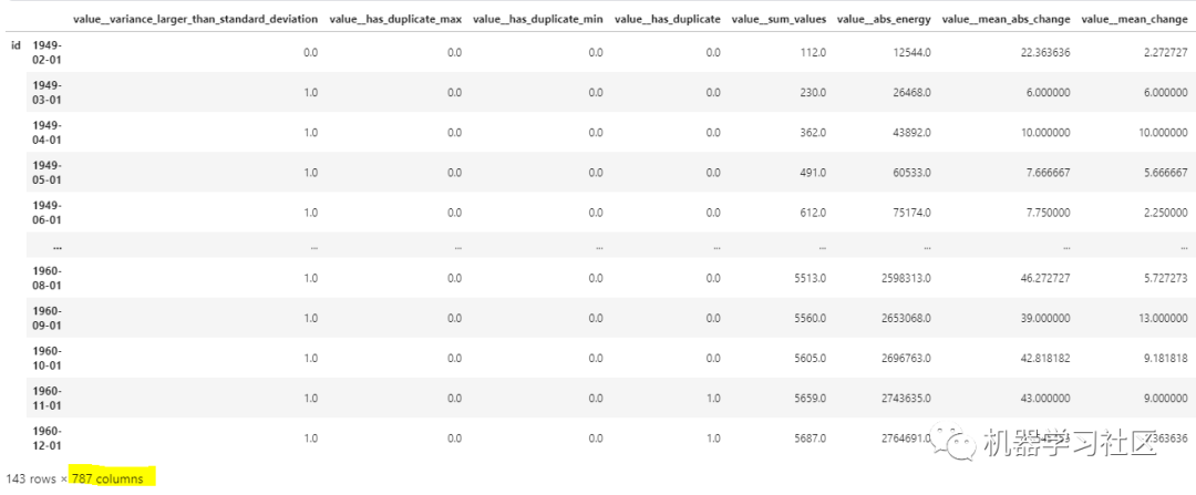 # Getting Comprehensive Features extraction_settings = ComprehensiveFCParameters() X = extract_features(df_shift, column_id="id", column_sort="time", column_value="value", impute_function=impute,show_warnings=False,default_fc_parameters=extraction_settings)
