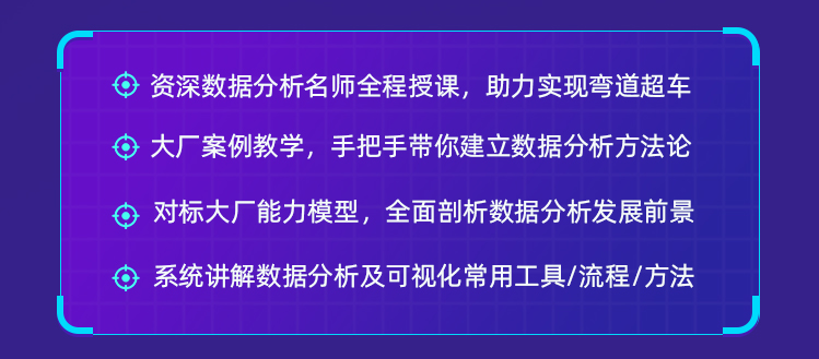 本次课程包含了数据可视化、数据分析方法论、数据思维及思维策略,实战与理论相结合,用通俗易懂的方式教大家进行数据分析,让你不仅学会一个数据分析工具,更是数据分析的逻辑与思路。