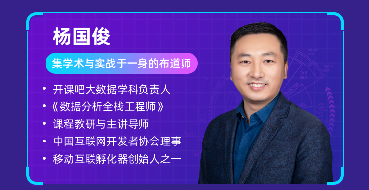 一位是开课吧大数据学科负责人杨国俊老师,有着13年大数据分析领域教研教学经验,著有《Python数据分析入门实战》,为美团、腾讯、小米等头部互联网企业及传统行业输送优秀数据分析人才培累计10000+,最高学员薪资50w+,学员平均薪资20w+。