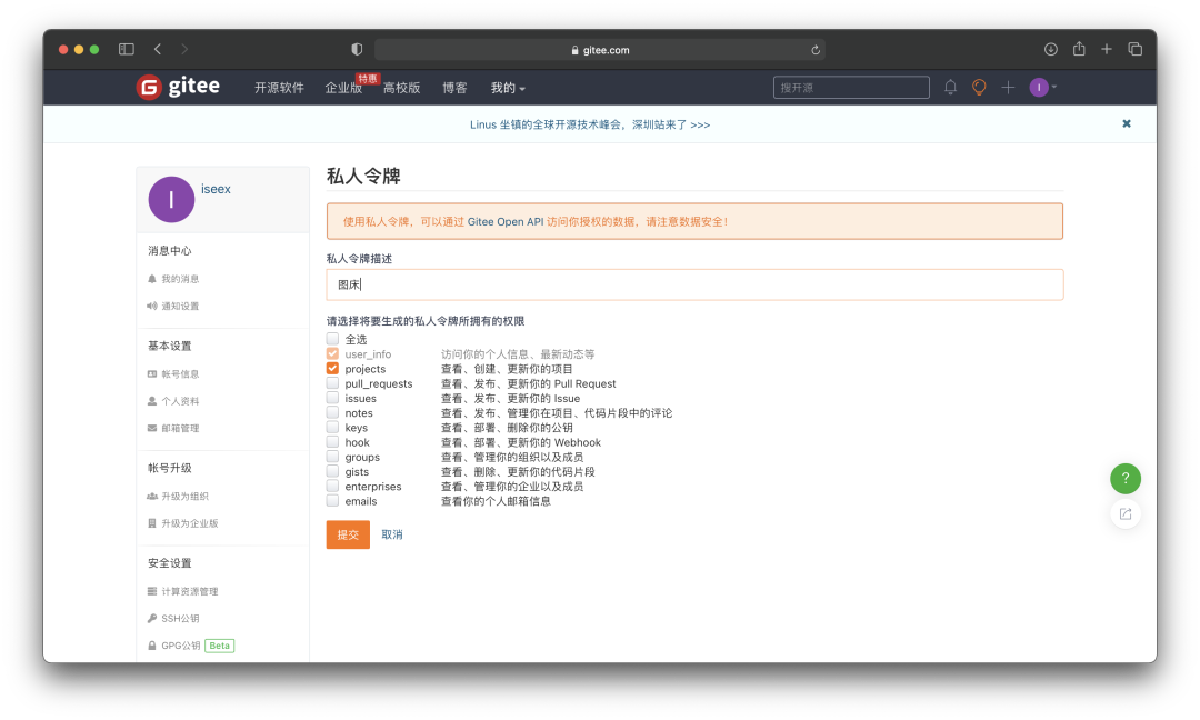生成新令牌如下图,先取消全选,再勾选projects,然后提交。