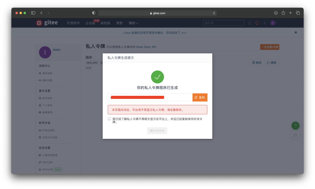 输入gitee账户密码到此便获得了私人令牌,点击复制,并保存好。因为该窗口关闭后,将无法再查看该私人令牌。