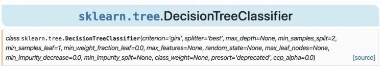 Python 是面向对象的编程。DecisionTreeClassifier 函数实际上是一个类,它创建该类的一个实例——一个对象。当我们调用 DecisionTreeClassifier 类时,它将依赖几个参数来定义要在 sklearn 文档中查询的算法行为。