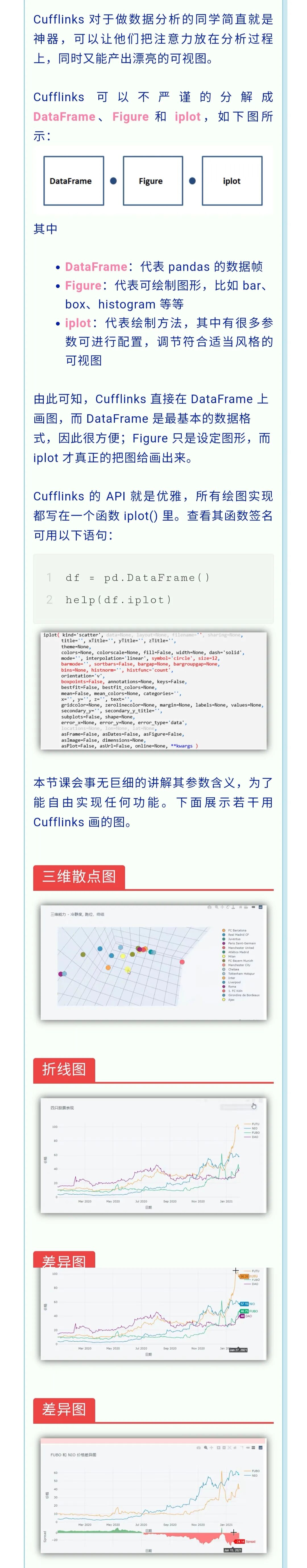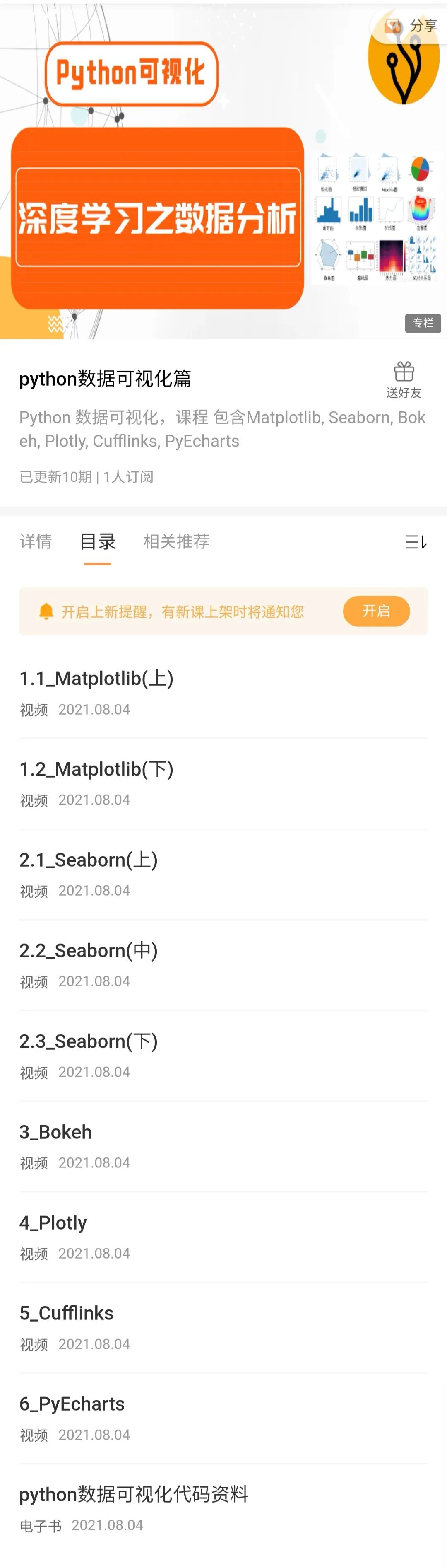 课程内容包括Matplotlib、Seaborn、Bokeh 、Plotly,Cufflinks、PyEcharts等。