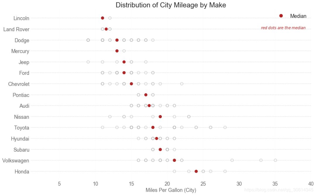 ax.text(33, 13, "$red ; dots ; are ; the : median$", fontdict={'size':12}, color='firebrick')