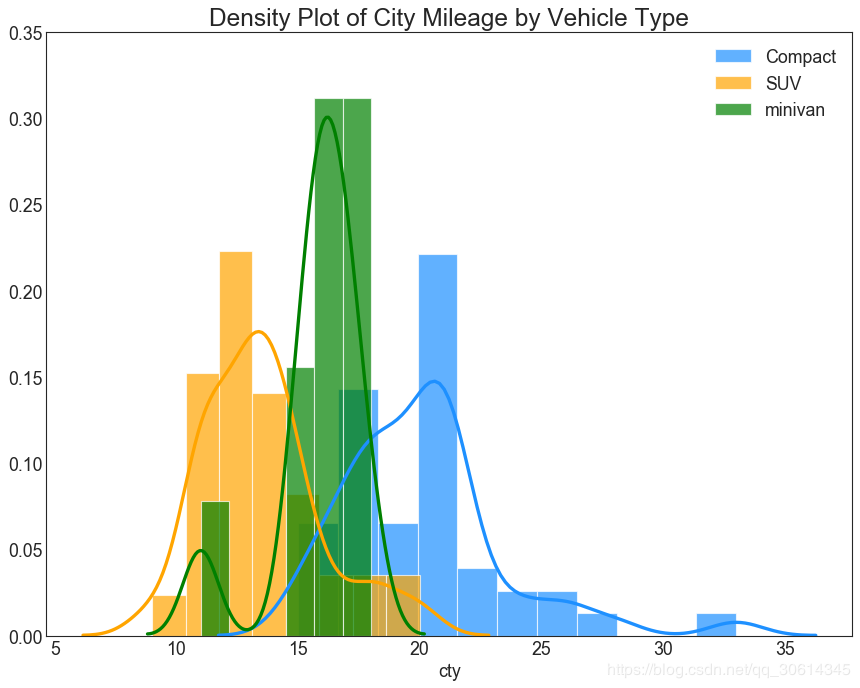 plt.title('Density Plot of City Mileage by Vehicle Type', fontsize=22)