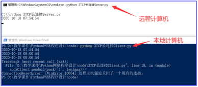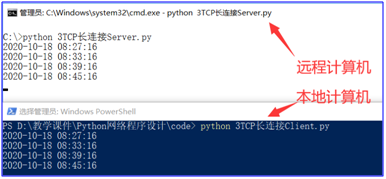 使用联网的两台计算机测试程序,一台计算机运行服务端程序,一台运行客户端程序,并把客户端程序中的本地回环地址'127.0.0.1'修改为服务端程序所在计算机的真实IP地址,运行结果如图3-6所示,删除或注释掉服务端开启保活机制的两行代码之后再运行,结果如图3-7所示。可以看出,如果没有开启保活机制,无法保持TCP长连接。如果客户端长时间不操作,再次发送数据时会因为连接已断开而失败。