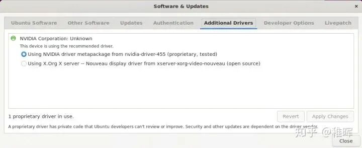 进入系统的图形桌面,打开Software & Updates软件,可以看到标签栏有一个Additional Drivers: 选择第一个安装Nvidia官方驱动(第二个是开源驱动)即可,根据网络情况稍等大概十分钟,安装完重启服务器。