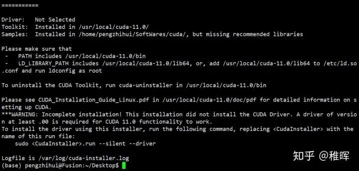 去官网下载cuda安装包:CUDA Toolkit 11.0 Download | NVIDIA Developer(https://developer.nvidia.com/cuda-11.0-download-archive ),相关选项如下(根据实际情况选择): chmod +x cuda_11.0.2_450.51.05_linux.run sudo sh ./cuda_11.0.2_450.51.05_linux.run可能会报一个警告: