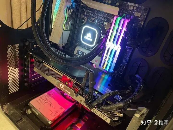 固态硬盘 :1TB西数NVME SSD + 1TB三星870QVO SATA SSD散热器 :海盗船H100X240水冷 + 若干120机箱风扇其中硬盘的设计是这样的:1T的NVME固态做系统盘,12T的机械盘作为数据集仓库,另外一个1T SATA固态作为训练时的数据集缓存,因为IO读写速度也是会影响训练效率的,所以相比于直接从机械盘里面读取数据,加一块SSD做cache效果会好很多。
