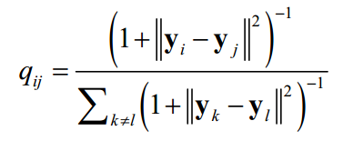 对称SNE虽然对SNE做了改进,但还存在拥挤问题,各类样本降维后聚集在一起而缺乏区分度。解决方法是用t分布替代高斯分布,计算低维空间中的概率值。相比于正态分布,t分布更长尾。如果在低维空间中使用t分布,则在高维空间中距离近的点,在低维空间中距离也要近;但在高维空间中距离远的点,在低维空间中距离要更远。因此可以有效的拉大各个类之间的距离。使用t分布之后,低维空间中的概率计算公式为