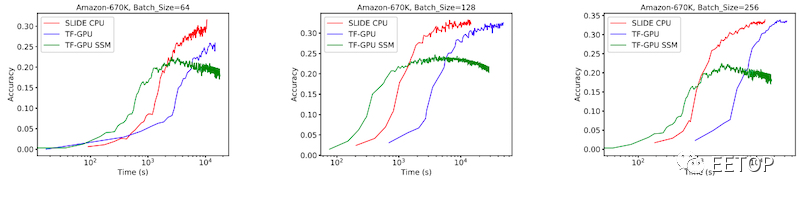 据称,SLIDE比现有最好的Tensorflow GPU硬件快3.5倍,比Tensorflow CPU的性能提高10倍。尽管研究人员使用的CPU型号还不太清楚目前可知使用的一个"44核 "CPU。