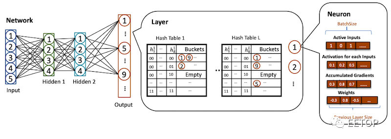 在最基本的层面上,SLIDE 使用采样哈希表,特别是修改后的局部敏感哈希(LSH),来快速查询神经元 ID 以进行激活,而不是逐个矩阵计算整个网络矩阵。它将这种技术与另一种称为自适应 dropouts 的技术相结合,后者用于提高神经网络中的分类性能。
